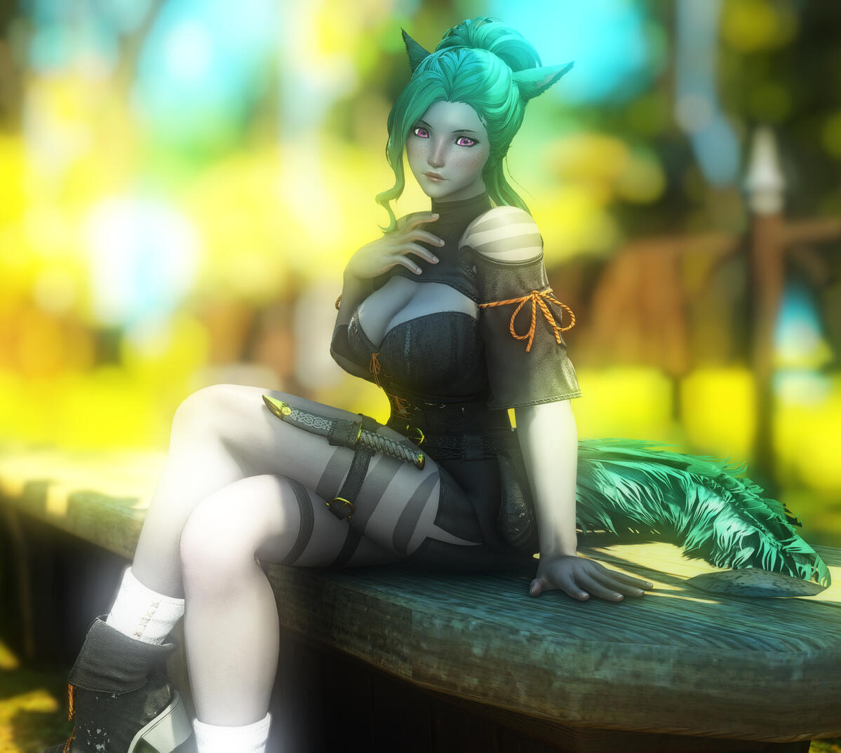 Born to a very traditional clan in the Shroud Lheila was born to become the matriarch of her clan, raised closely by her mother in an effort to shape her into the leader her clan needed and wanted. The young Keeper, though, had dreams of adventure and exploration, but didn't want to let her clan down. She learned the ways of the huntress, and during her teenage years this was enough for her, hunting beasts and monsters within the Shroud she loved, yet those dreams never left her, and it all came to a head during a violent argument with her mother.Having a sister younger than herself, one whose personality was infinitely more fitted for being a matriarch, Lheila's mother resented her wasted efforts in someone whom just wanted to see the world. The final argument they had grew so heated that Lheila broke her inherited family lance and cast it aside, choosing to leave and free her mother of obligation, allowing her to focus on the right daughter, whilst giving herself the freedom to pursue her dreams. She wanted to explore the world and see things beyond the Shroud.Lheila made her way to the coast, and then to the city of Limsa Lominsa. She'd never been on a ship and she found herself falling in love with the sea, the means to travel to distant, unseen lands. Arriving in the city, she quickly found work using her experience as a huntress, even undertaking training with a large axe she'd never wielded before, and then taking on numerous jobs hunting local beasts to save money enough to travel.